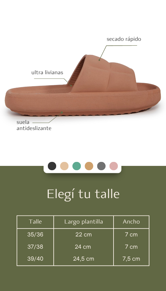 Fabricadas con goma inyectada de alta densidad, ultra liviana y flexible. Su material es de secado rápido, ideal para uso cotidiano, playa o pileta. Diseño de líneas cuadradas y una estética chunky para looks relajados, urbanos o de verano. Combinan simplicidad con volumen para un estilo actual y sin esfuerzo. Producción argentina de calidad premium.
